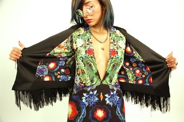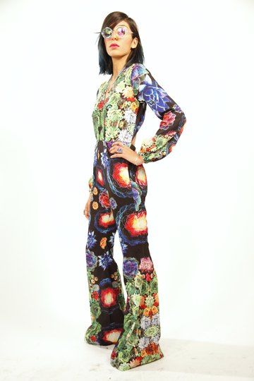 Maya Romper is a one of a kind succulent print. two front front pockets. Made with a Poly Crepe de Chine. Model is 5'8" size 2
