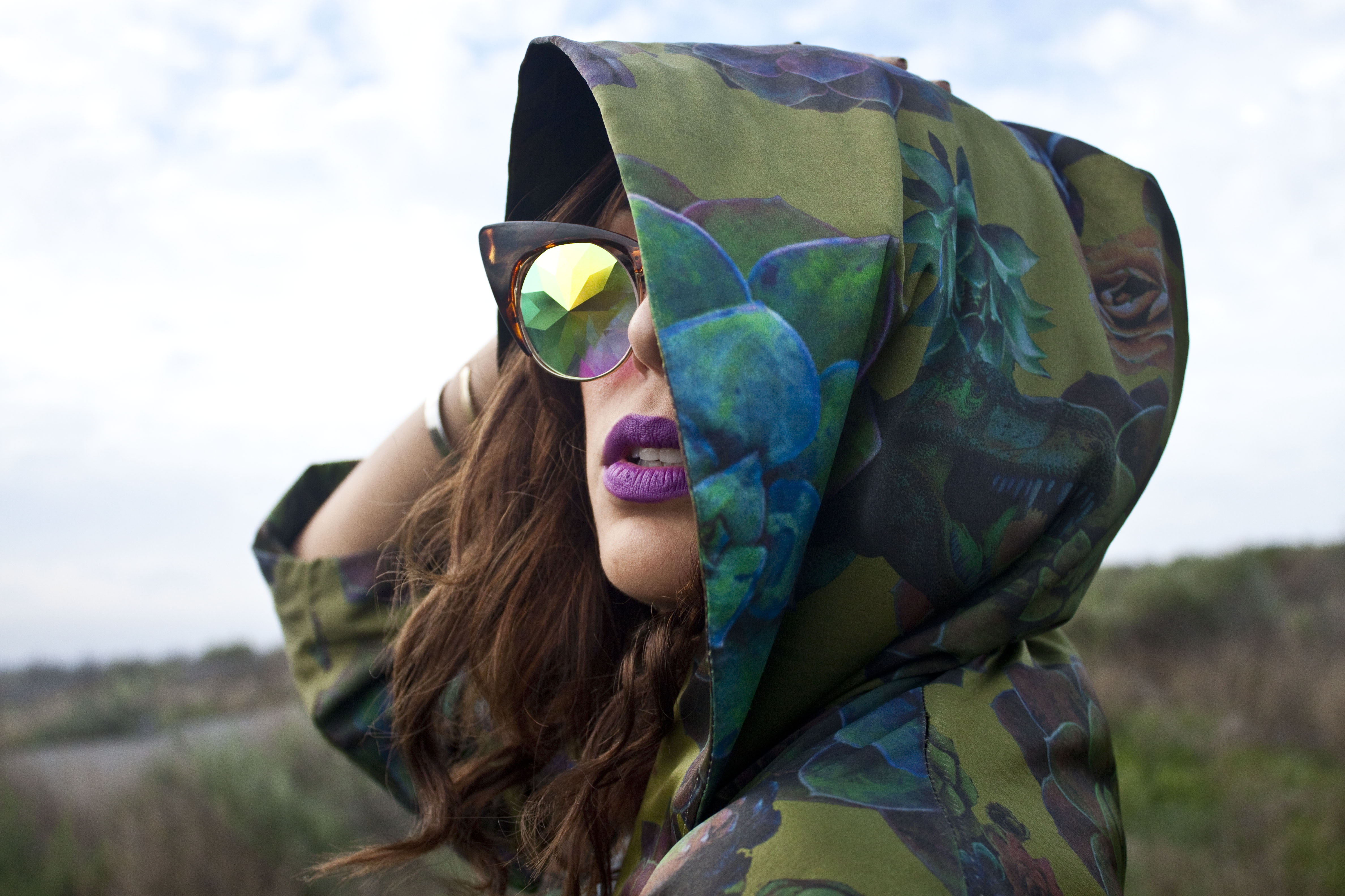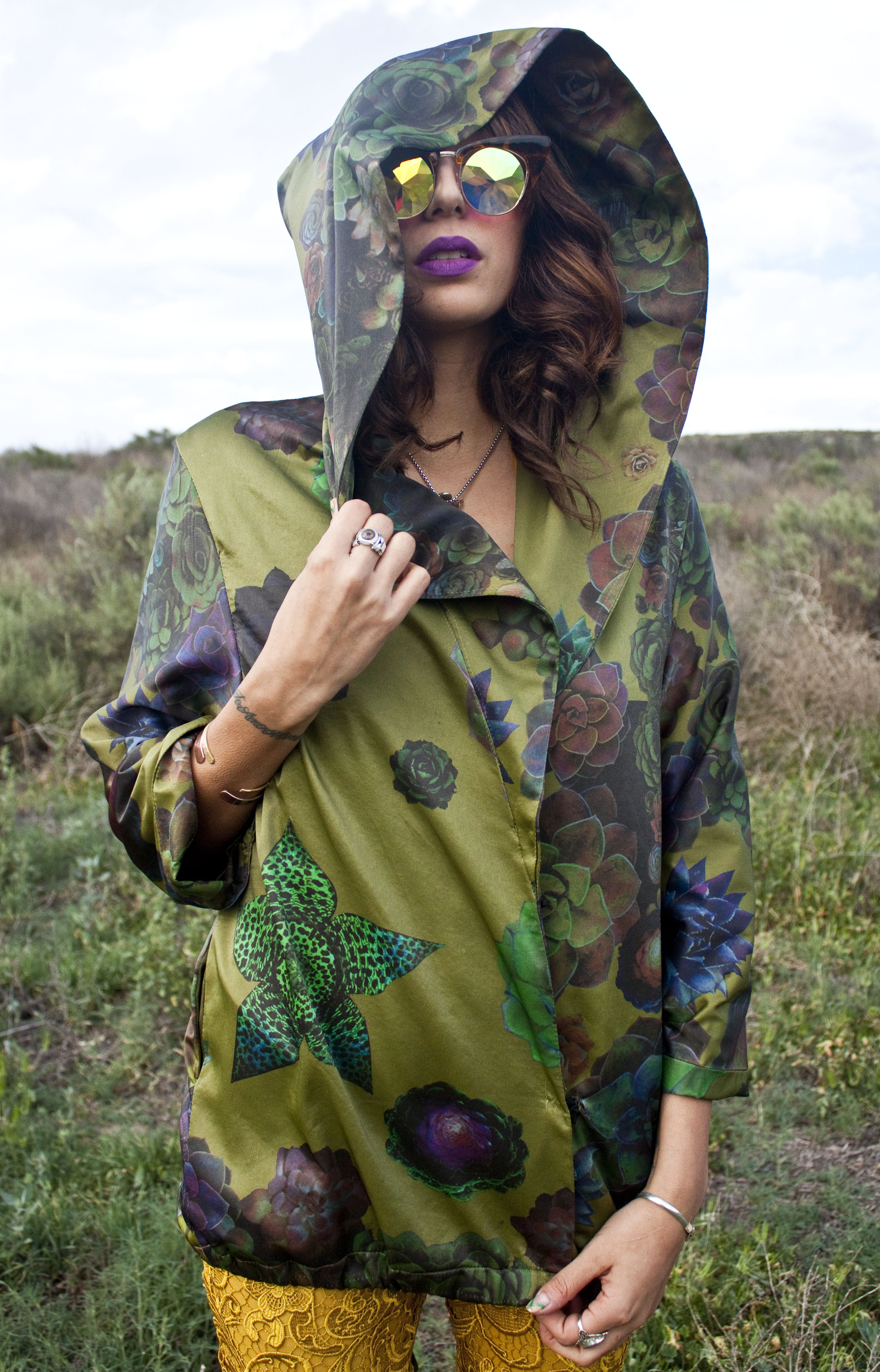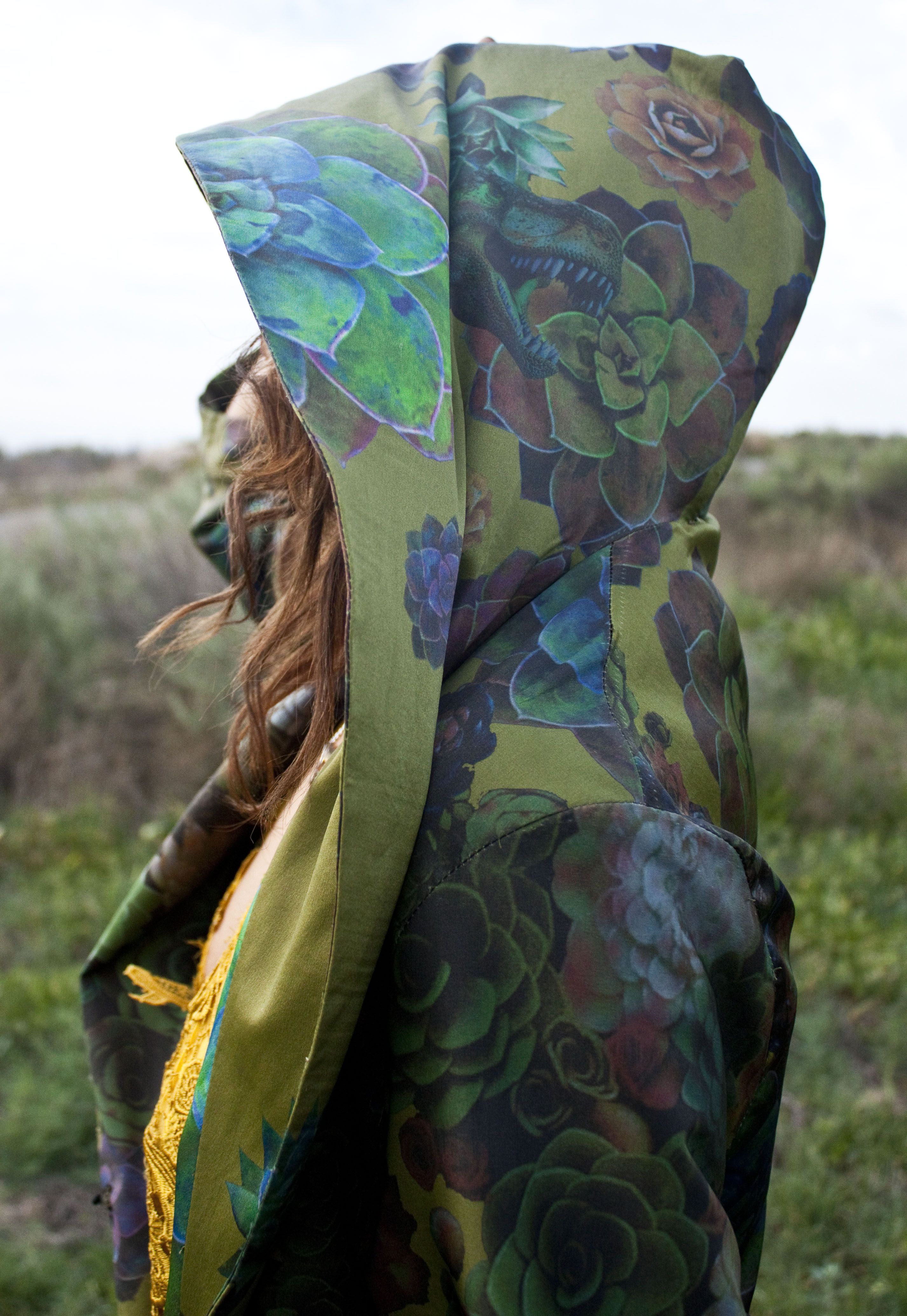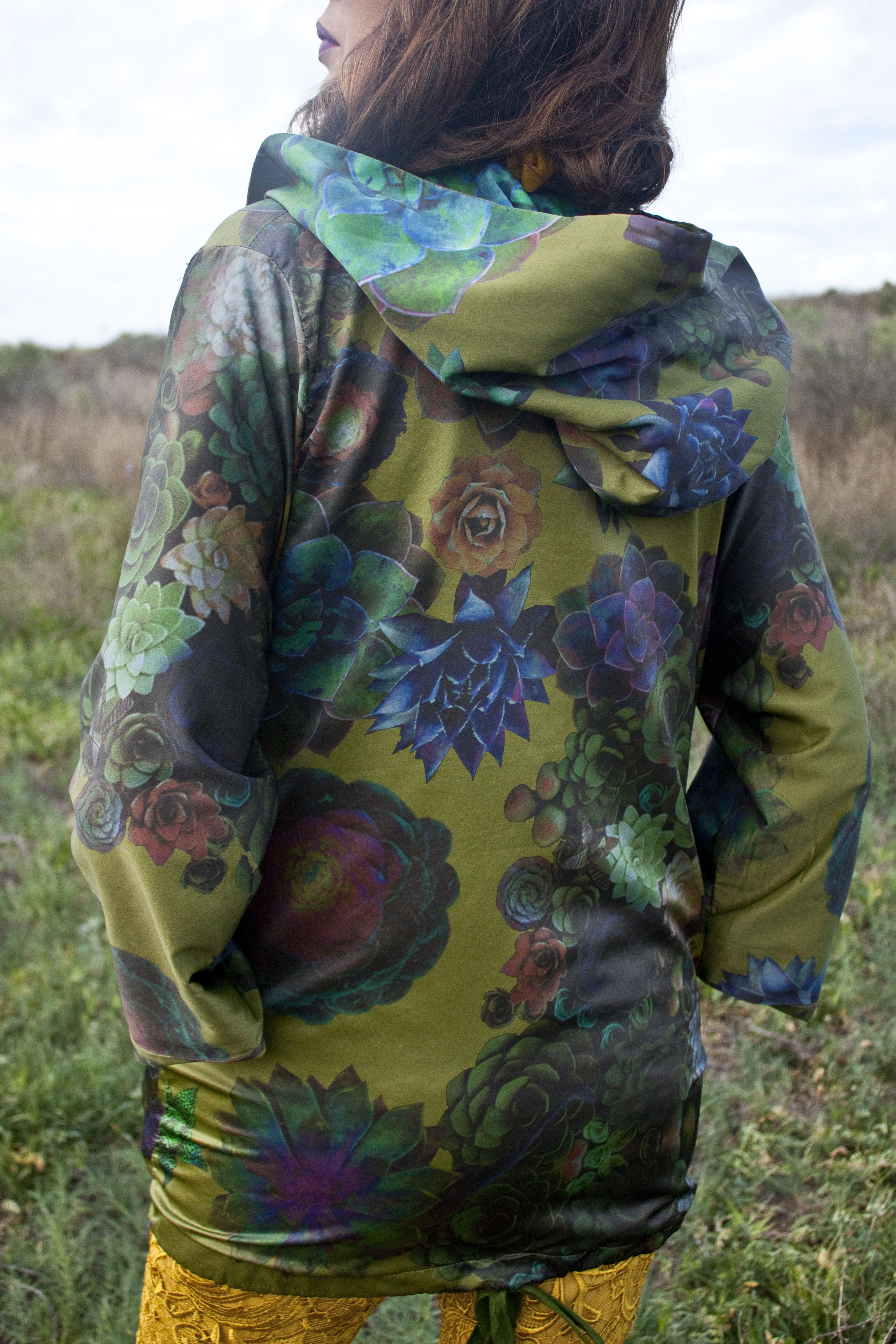 One of a kind silk crepe de chine Hoddie jacket. made with a beautiful succulent dinosaur print created by designer. Jacket is fully lined and has two side pockets large enough to hold a beer,and two hidden pockets for festival goodies.