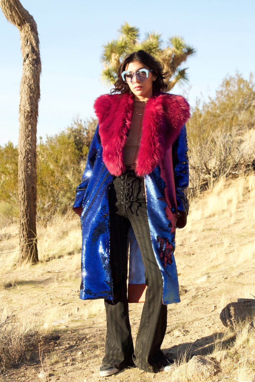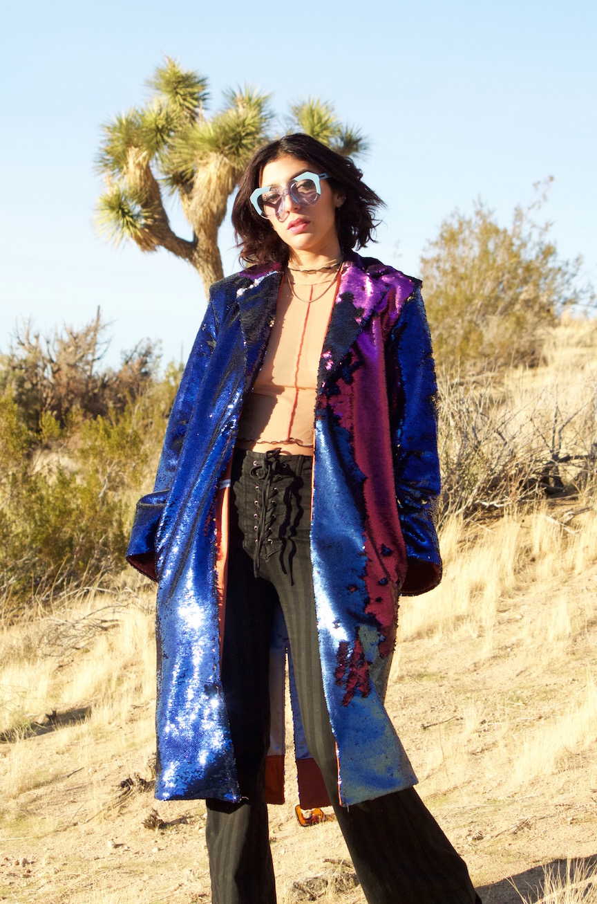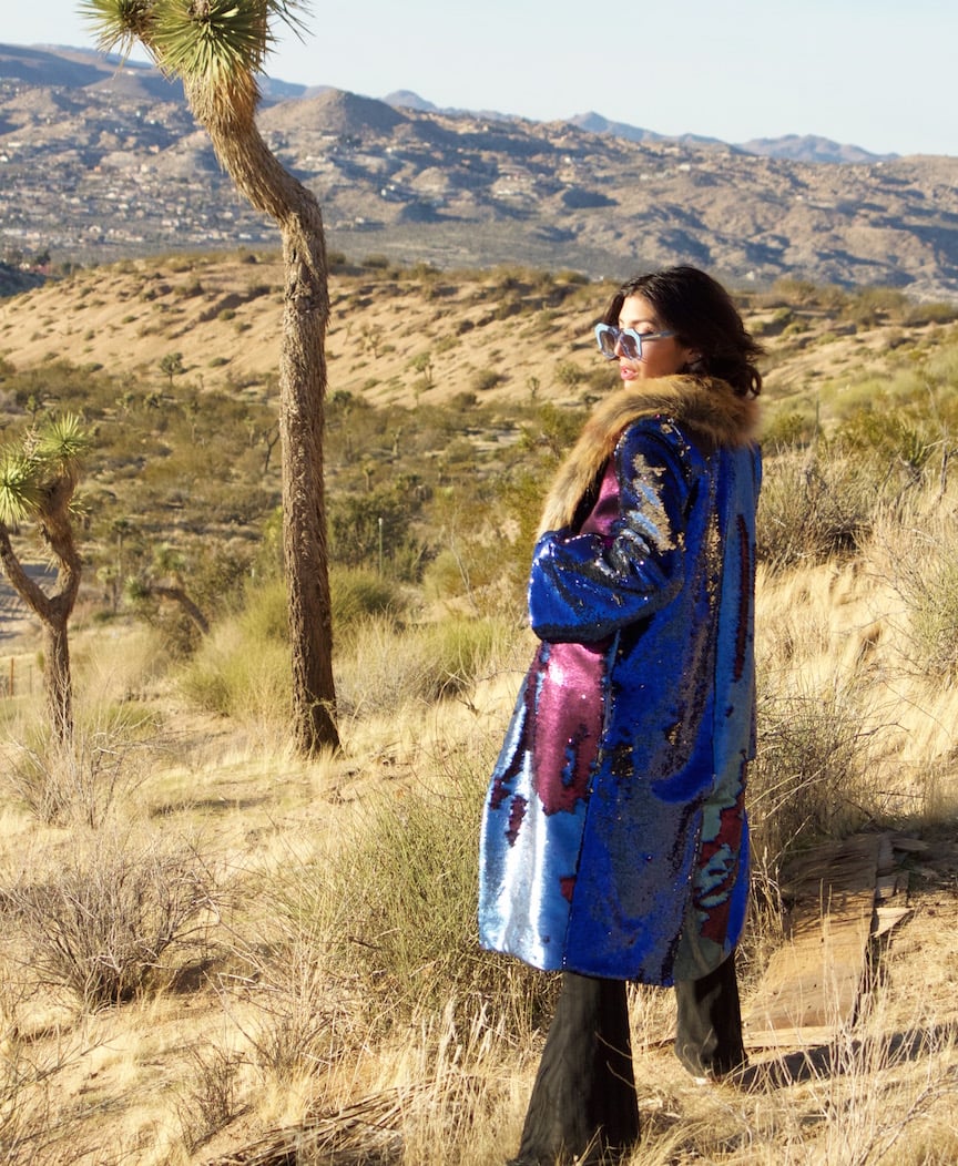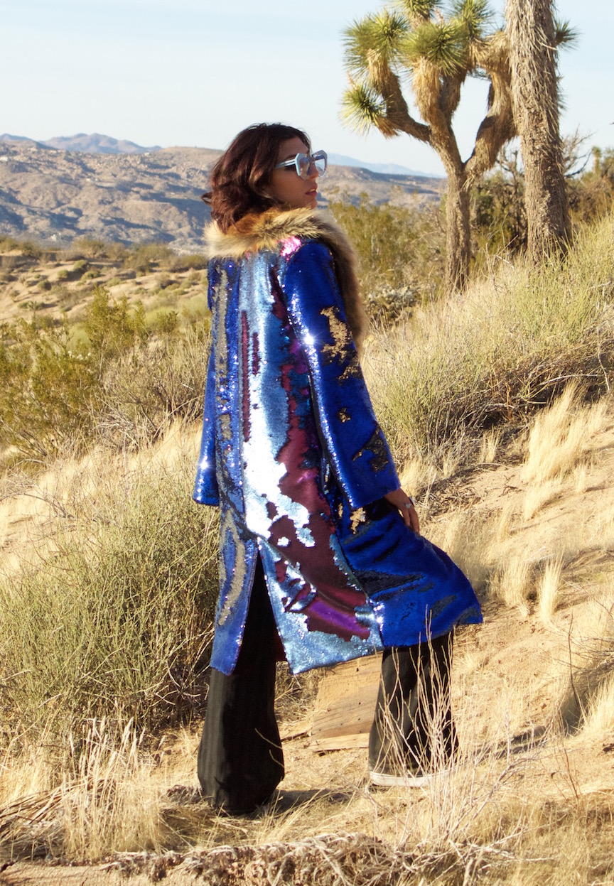 The Sir Elton is a sequin long bell sleeved coat great for festivals and expressing your unique style. The sequin is blue /silver or purple/light blue depending on which way you brush onto it. Very 70's rocker vibe. It has two outter pockets and one secret joint pocket in the inside lining. Lining is a poly /silk blend. Has a fur collar that you can attach or detach depending on your style. Fur collar sold separately. This jacket is one of a kind. Will also make custom order for different sizes.