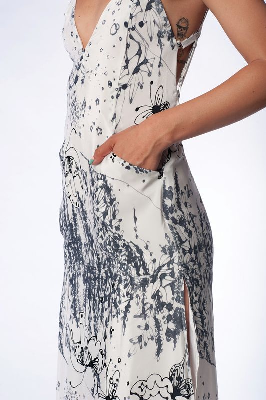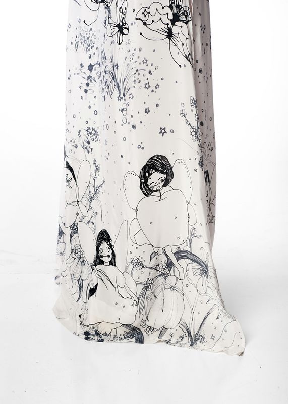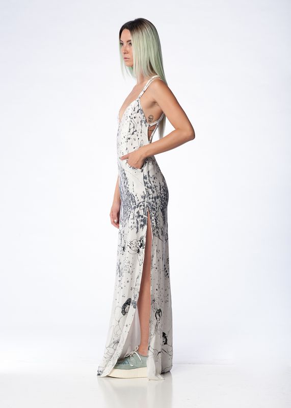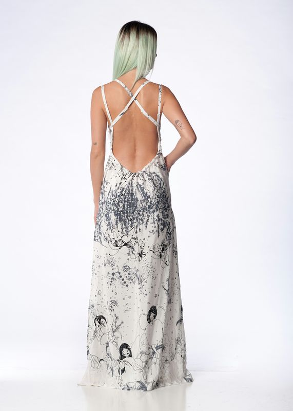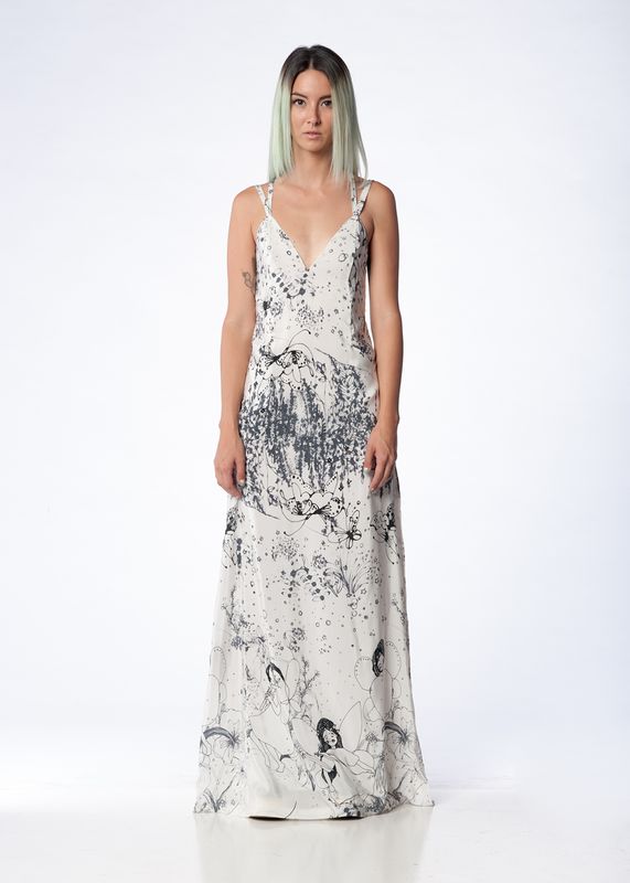 Adjustable straps, Anime fairy print fabric with slit on left side of dress, two front pockets